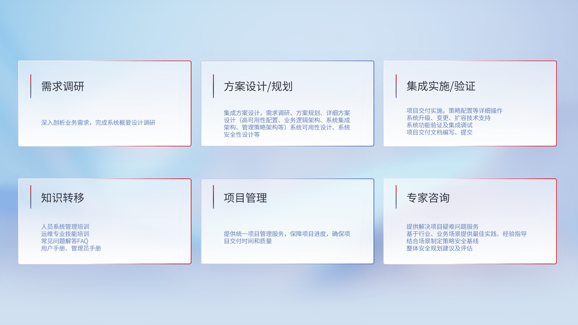 针对客户行业特性,,,将宏观的安全战略和需求,,,,通过专业的交付服务,,,,实现项目落地,,,,为客户提供标准规范的集成交付服务。。。。